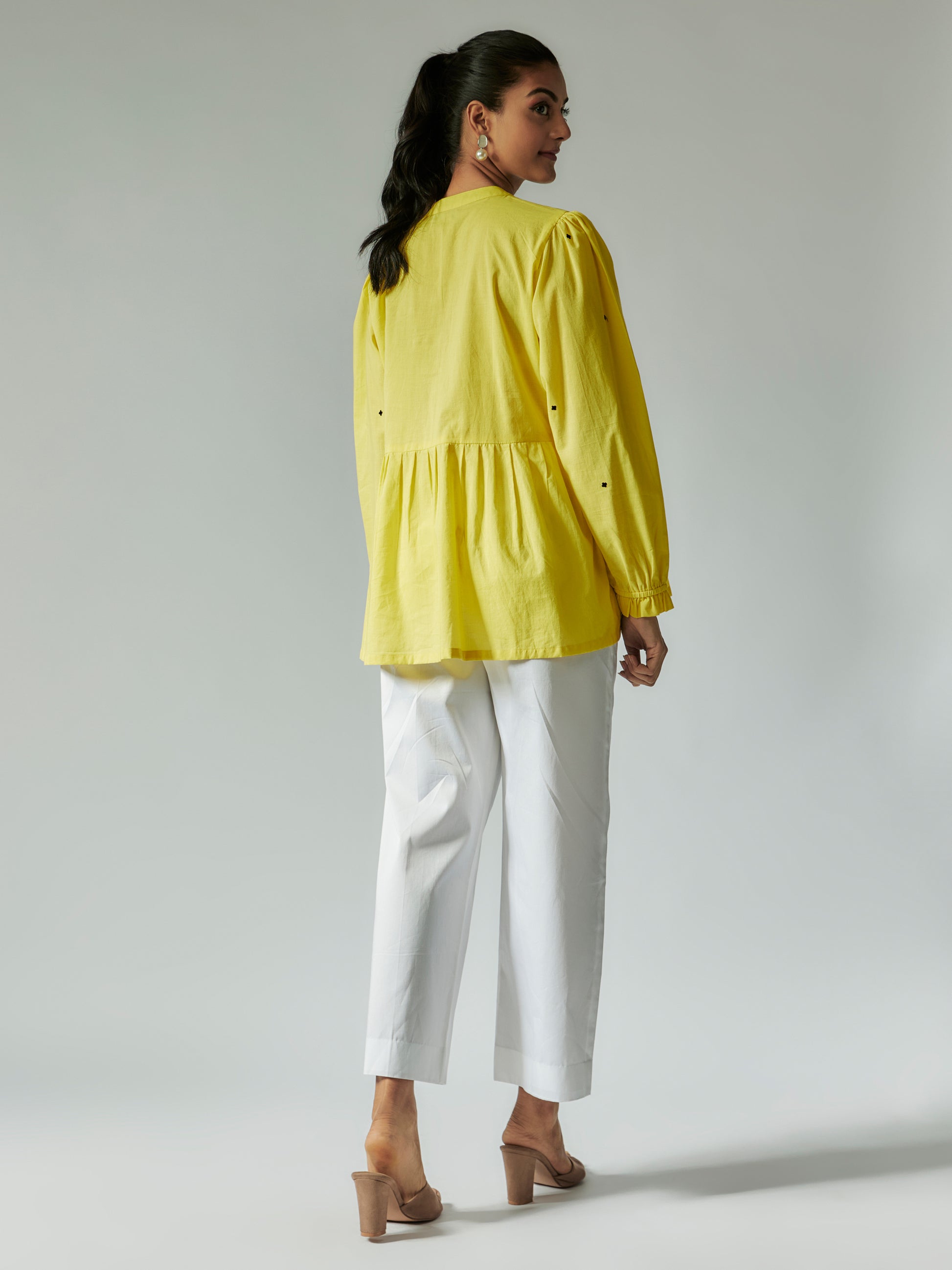 Full Sleeves Co-ord Set with Cotton Mul Lime Yellow Top with Clove Leaf Embroidery and Cotton White Pants
