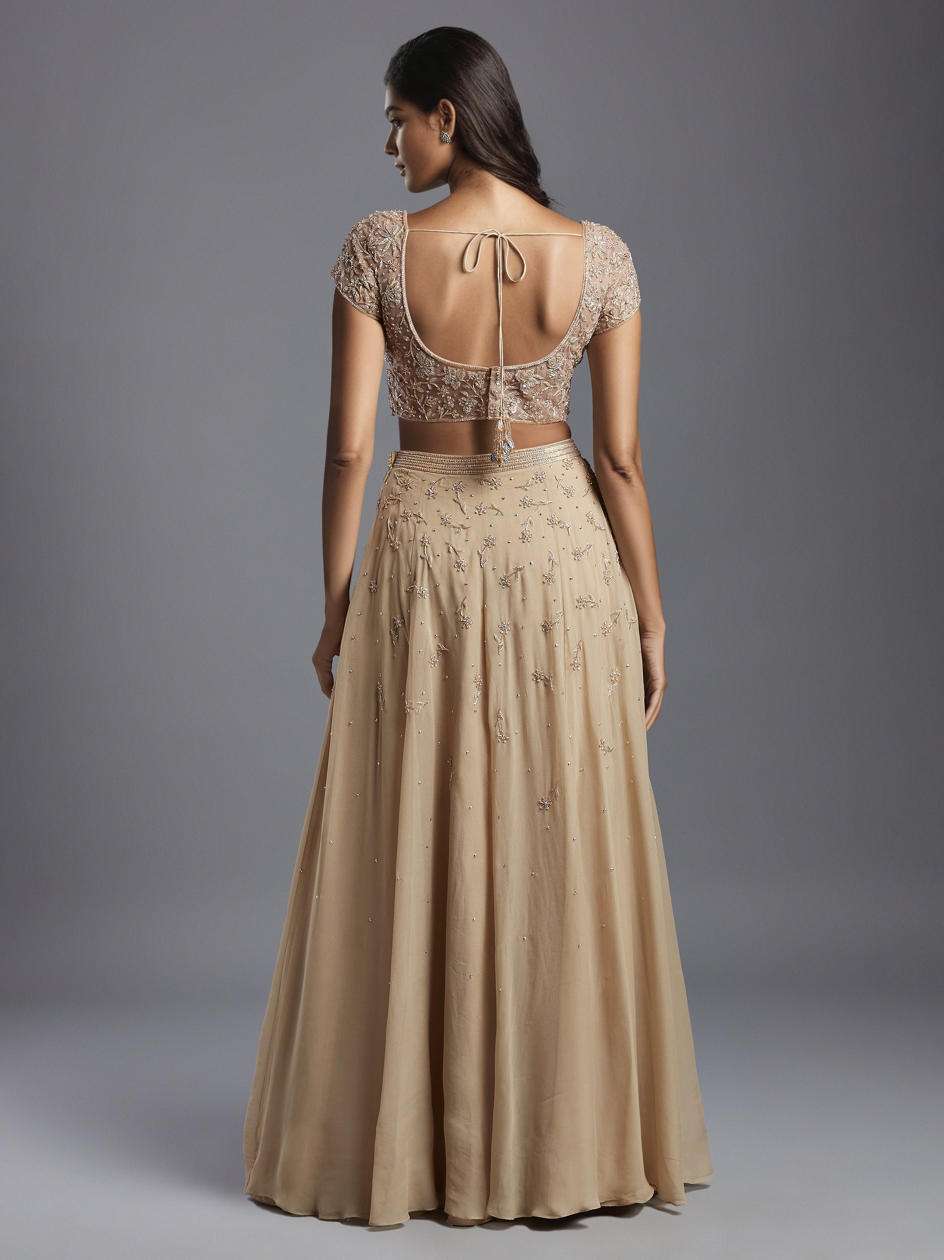 Featuring a nude lehenga in a georgette base. It is paired with an embroidered net blouse and matching dupatta
