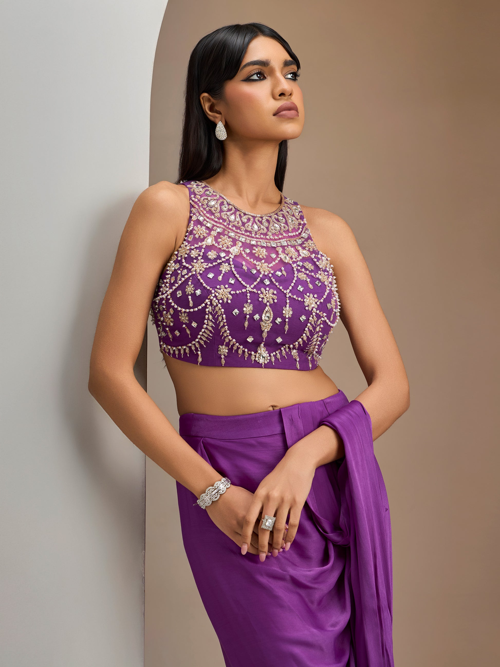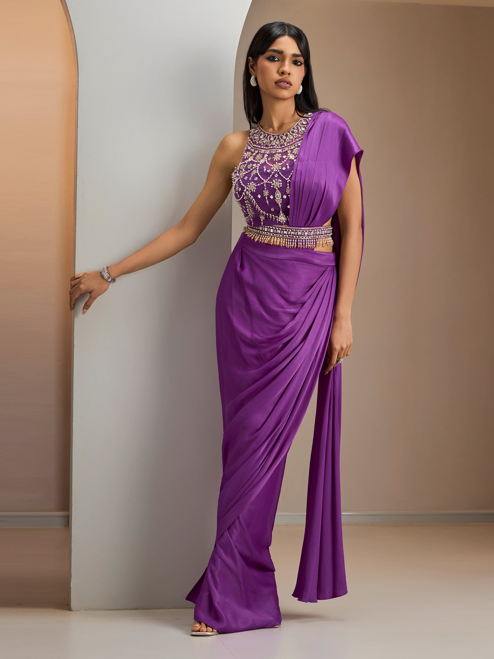 Purple Net Blouse With Hip Ruched Georgette Saree With Belt